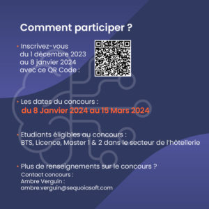 Pour plus d'informations sur le concours et pour toute question, n'hésitez pas à contacter Ambre Verguin au 06 79 88 13 80 ou par mail à ambre.verguin@sequoiasoft.com.