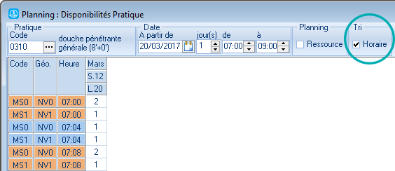 - En activant la visualisation des dispos des ressources les unes en dessous des autres, on peut maintenant effectuer un tri horaire (version thermale) :