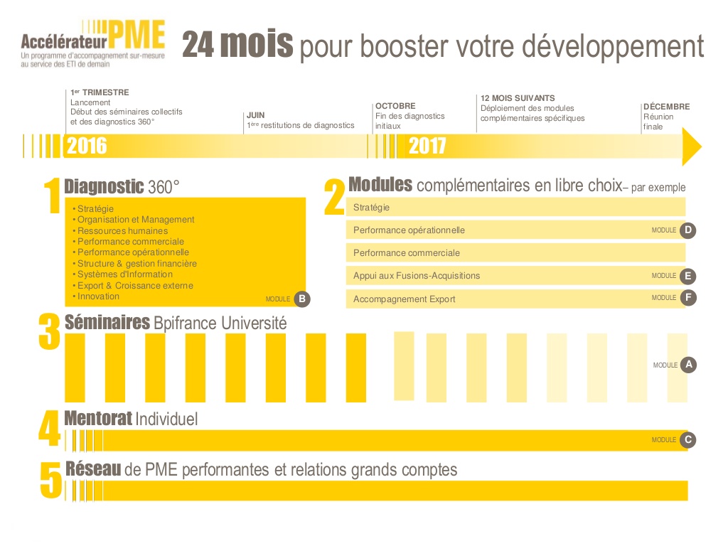 Accélérateur PME is a tailored scheme designed to aid 60 French SMEs selected for their growth potential and ambition to become intermediate-sized enterprises.